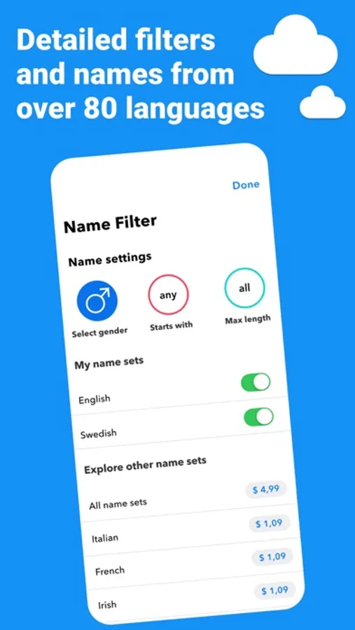 You get one name set for free based on your location and if you want you can easily buy additional name sets for a small fee.