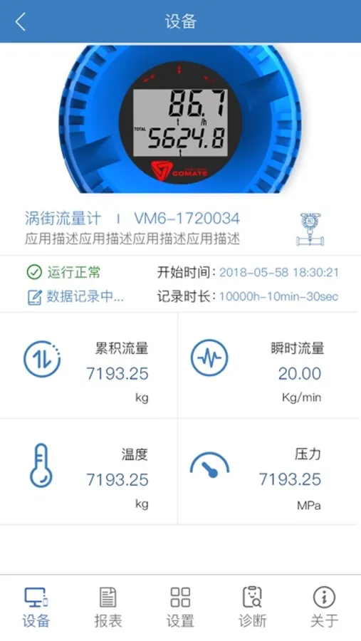 该软件适配于合肥科迈捷智能传感技术有限公司的智能流量计,如VFM系列涡街流量计、TGF系列热式气体质量流量计,用户通过安装该APP软件,可通过蓝牙远程查看科迈捷公司的智能流量计运行数据,并可对流量计进行配置操作。