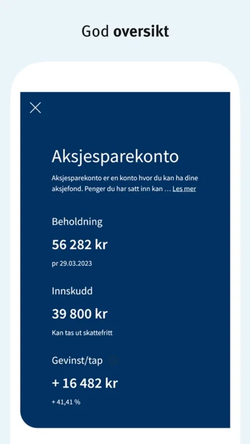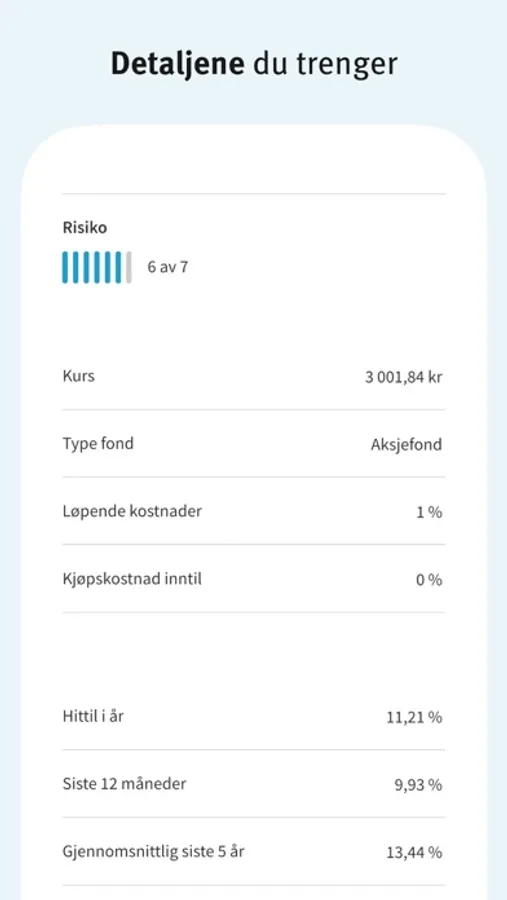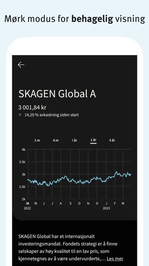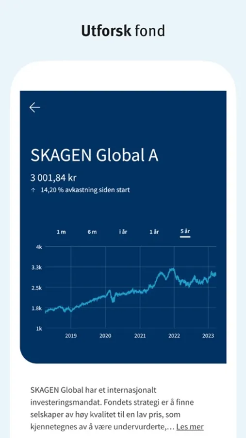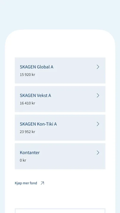 Spar i fond og sjekk avkastningen din, når som helst. Du kan fritt velge mellom over 600 fond, og få kursvarsler for alle SKAGENs fond. Innlogging er enkelt med biometri, BankID eller Vipps. Gi oss gjerne tilbakemelding på kundeservice@skagenfondene.no