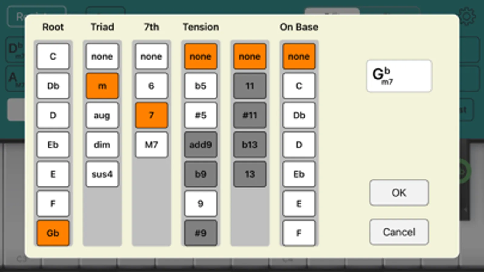 This app can display each note of the component tones (root, triad, 7th, tension, on chord) of selected chord on the keyboard, play chord sound.