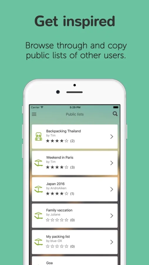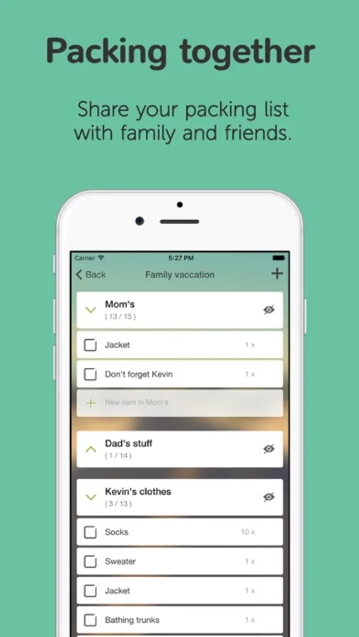* Travelling with others is more fun. Share your packing list and start packing with family and friends. (only with users account)