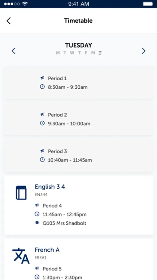 Parents, students and staff can see an easy to read view of the current day’s timetable. By clicking on the class, students and staff will be able to access the class’ iLINQ Page.