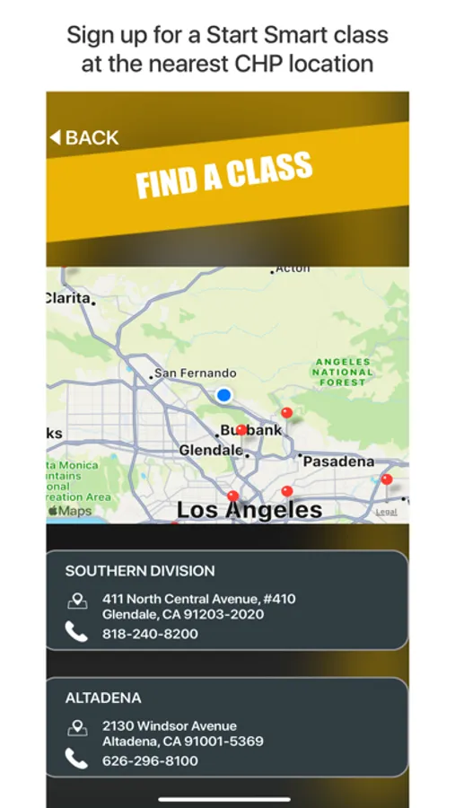 The Start Smart app also includes a map with locations of nearby CHP Area offices where you can attend a free and exciting Start Smart class. These classes are designed to help teen drivers become more aware of the responsibilities that accompany the privilege of being a licensed California driver.