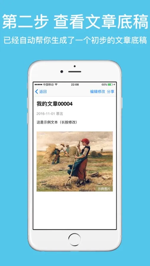 点击文章标题,即可查看文章,现在app已经自动给你生成了一个初步的文章底稿,有标题、作者、一段示例文字、一个图片,下面就可以修改编辑这篇文章了。