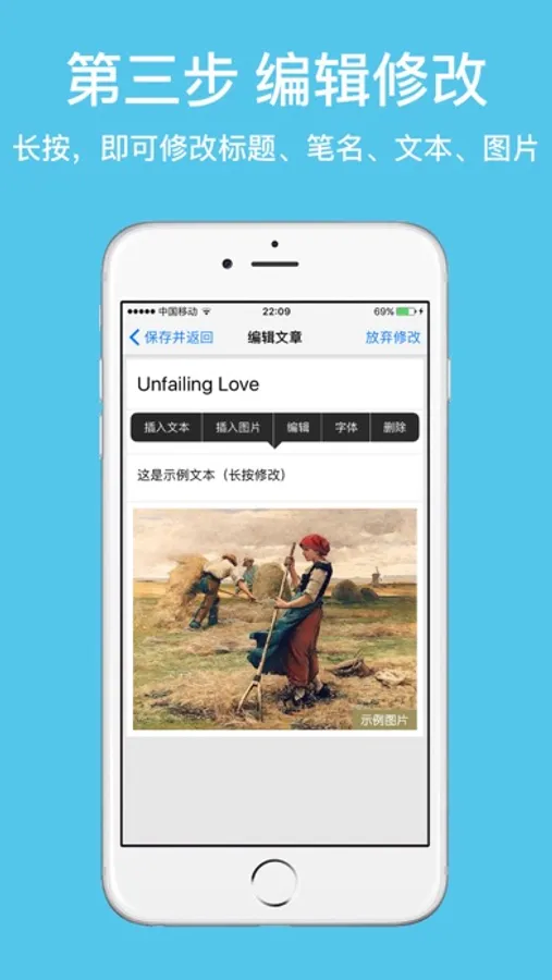 点击右上角“编辑修改”,即进入编辑修改文章状态。长按文章中任何一处,在弹出的菜单上选择相应的操作,即可对文章进行编辑,包括: