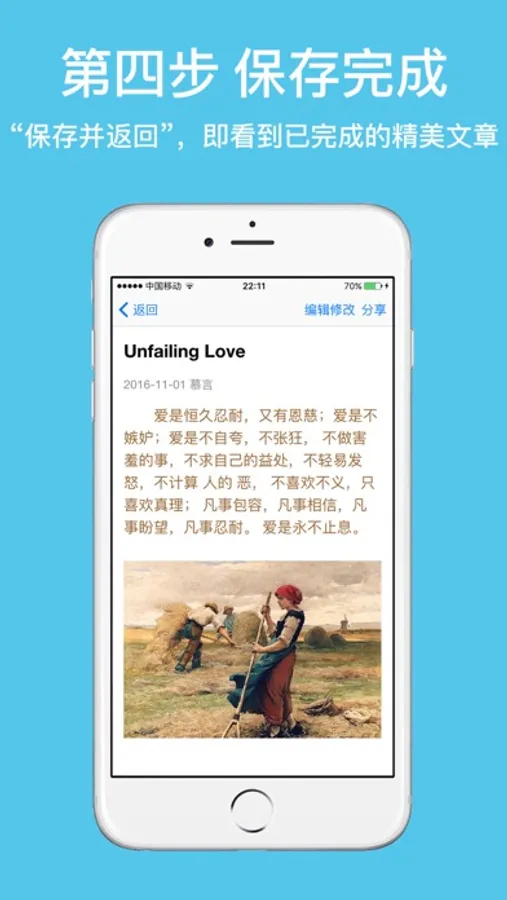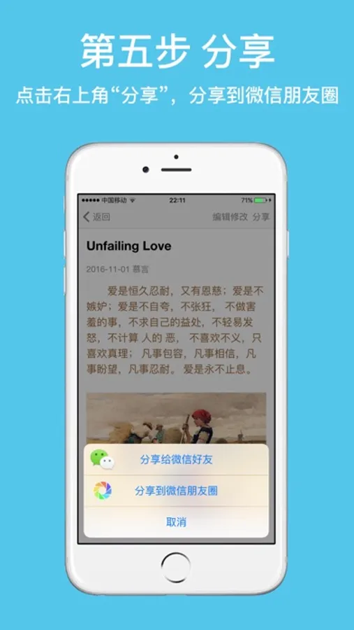 现在,只需在手机上简单的几步操作,就可以自己编写精美的文章,分享到微信朋友圈、分享给微信好友,让他们直接给你点赞吧!