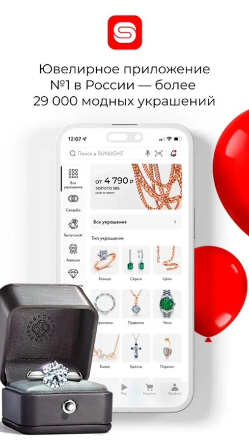 Ювелирные изделия и украшения из золота и серебра со скидкой до 80% только в SUNLIGHT! У нас есть кольца, цепи, украшения с драгоценными камнями, часы и другие изделия. С помощью удобного приложения вы можете делать невероятно выгодные покупки, получать подарки, купоны и скидки на ювелирные изделия и украшения, а также участвовать в акциях и распродажах в более чем 400 магазинах SUNLIGHT по всей России. Все изделия исключительного качества, в основе которых: золото 585 пробы, серебро 925 пробы и драгоценные камни.