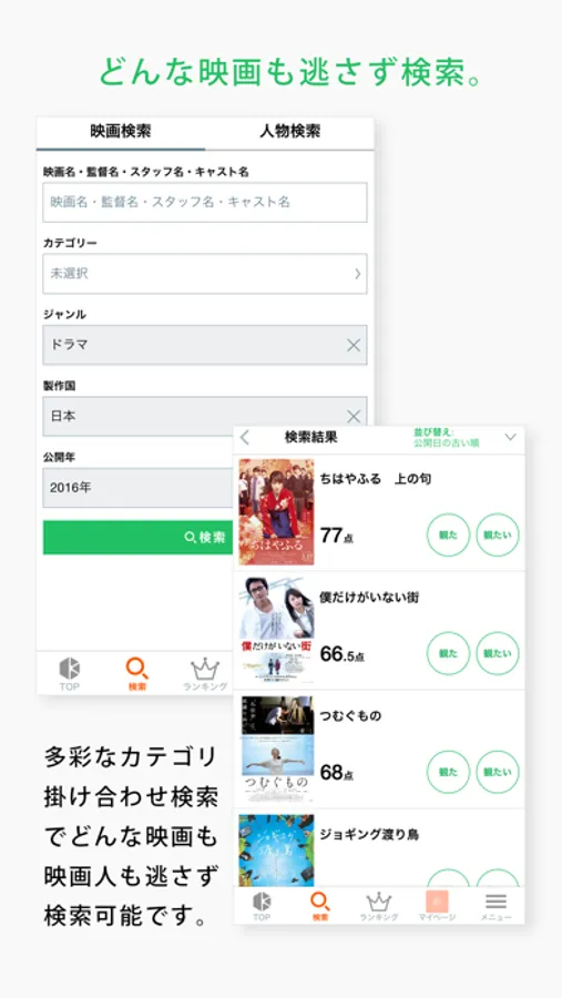 :映画名、スタッフ・キャスト名のキーワード検索はもちろん。映画カテゴリー・ジャンル、タグ、製作国、公開年での掛け合わせ検索が可能。「今年公開されたアメリカのコメディ映画が知りたい」なんて要望にも答えます。