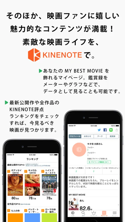 :あなたが登録した鑑賞記録の累計本数、レビュー本数などのデータや、自分がつけた評点の高い順にランキングされる「マイ評点ベスト5」などであなたの鑑賞記録をデータとして閲覧できます。