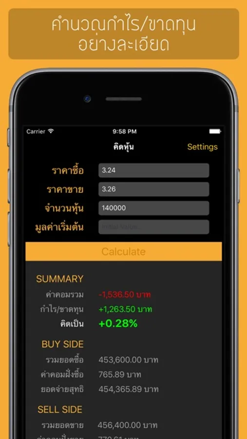 1. คิดหุ้น - ใช้เพื่อคำนวณ ค่าคอม ยอดจ่ายสุทธิ (ซื้อ) ยอดรับสุทธิ (ขาย) และ กำไร/ขาดทุน โดยสามารถเลือกประเภทบัญชีที่ใช้ในการเทรด กำหนดอัตราค่าคอมแบบขั้นบันได หรือใช้อัตราคงที่ของแต่ละขั้น และเลือกรูปแบบการส่งคำสั่ง (ผ่านอินเทอร์เน็ตหรือเจ้าหน้าที่การตลาด)