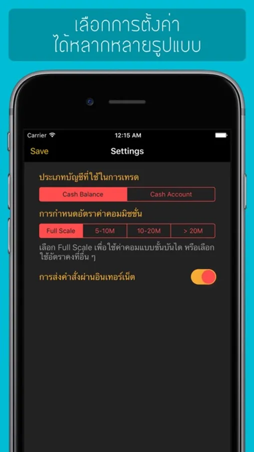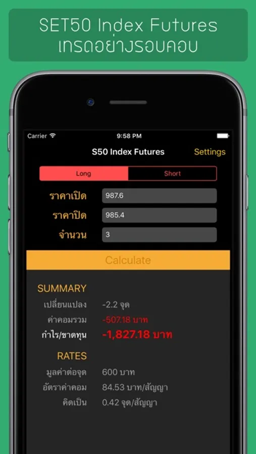 2. SET50 Index Futures - ใช้เพื่อคำนวณ ค่าคอม มูลค่าต่อจุด และกำไร/ขาดทุน ของแต่ละฝั่ง โดยสามารถกำหนดอัตราค่าคอม และรูปแบบการส่งคำสั่งได้เช่นเดียวกับคิดหุ้น