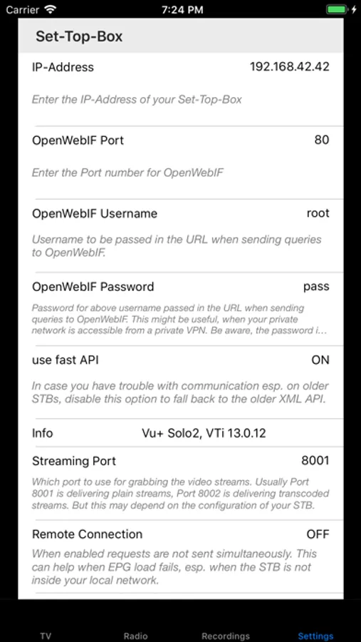 This App is a simplistic playback client for TV and Radio streams served by Enigma2 based set-top-boxes (STB) using the OpenWebIF web service running on the STB. Just enter the IP-Address and the port number of your Enigma2-based TV receiver and start watching Live-TV-Streams or Recordings stored on the STB.