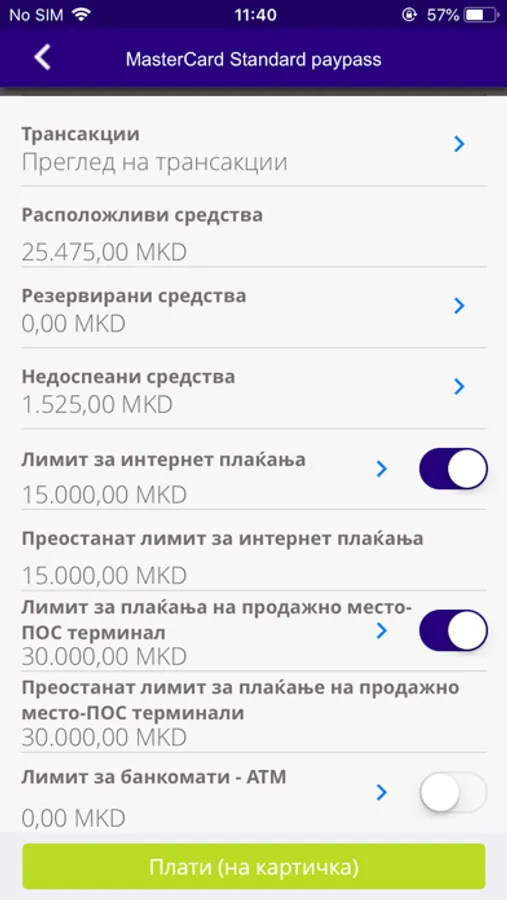 · Можност за поставување на лимит на картичка за трошење на Интeрнет, АТМ/Банкомат и продажно место/POS