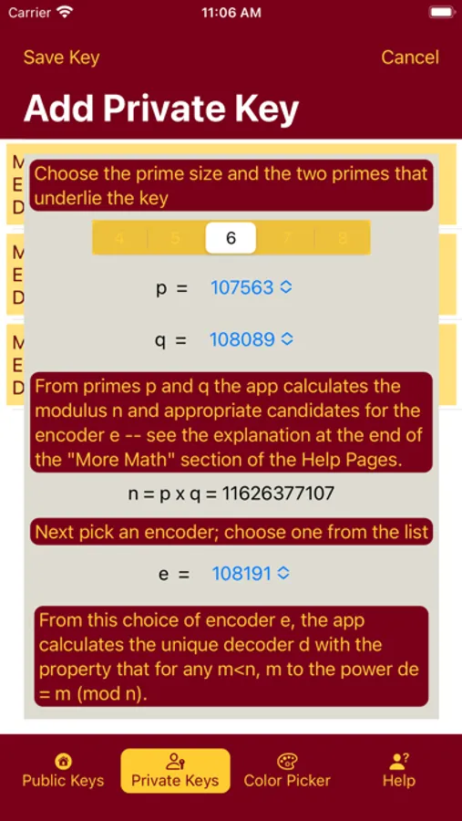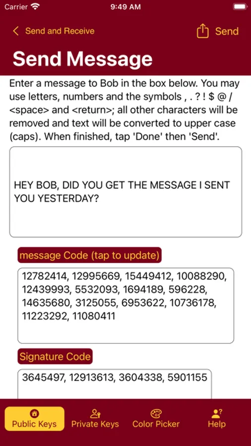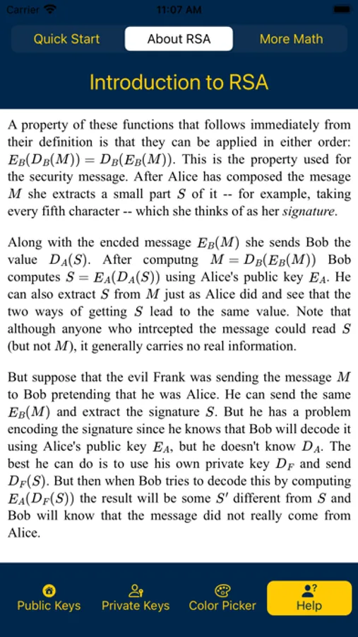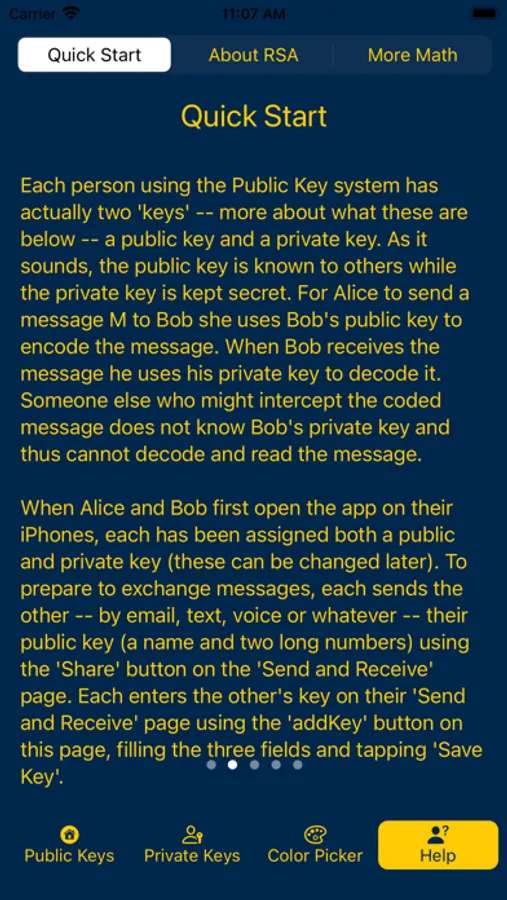 This app is intended as a tool for understanding a method of encrypting messages known as Public Key Cryptography (RSA). Invented in the 1970's this method still (in 2023) underlies much of the secure electronic transfer of information including communication with a bank (either online or from ATM machines), ordering goods online, transfering medical records and much more. The app is NOT designed for actually sending secure messages; the version of the method implemented here is intensionally a 'toy' version which is more easily understood than the full version. You will see how messages are encoded and decoded and their authenticity verified by using the app to exchange messages with colleagues and friends. The extensive help pages explain most of the mathematics behind this method. It involves concepts often presented to 2nd or 3rd year university students but is accessible to smart and curious middle-school students; the original version of this app was in fact written to accompany a series of sessions of the author with the seventh-grade math class of one of his grandchildren.