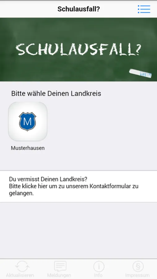 Du vermisst deinen Landkreis. Schick uns doch einfach eine Mail, wir geben deinen Wunsch gerne an die zuständige Stelle weiter.