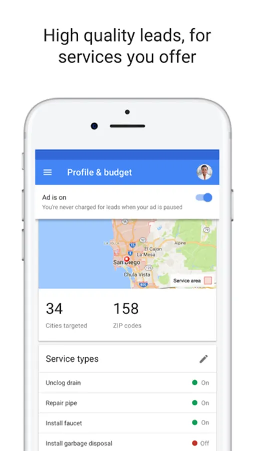 Local Services ads make it easy for service providers, like electricians and plumbers, to get found online and get more jobs. Get seen at the top of Google, and get high quality leads from consumers that are looking for services like yours. All Local Services providers are vetted by Google, so you can quickly build trust with customers who need your services. Ads are easy to set up and you pay per lead, so you only pay for leads relevant to your business. Most leads are phone-based so can you connect with customers on-the-go.