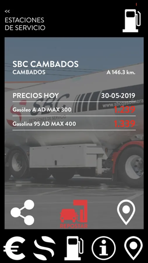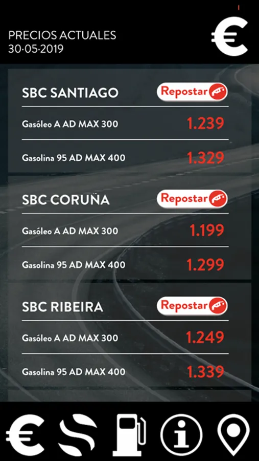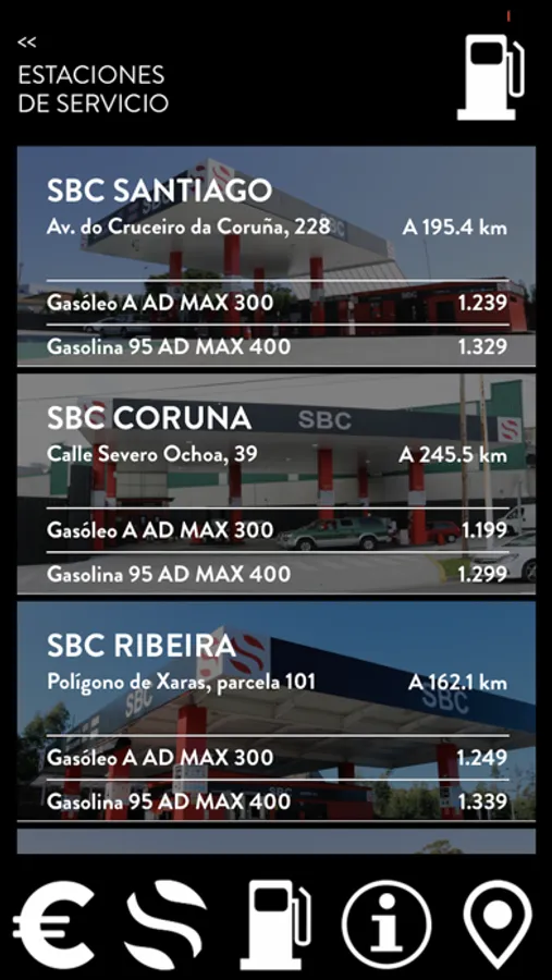 Con nuestra app podrá consultar entre otras cosas dónde se encuentra la gasolinera SBC mas cercana a su posición, así como la ruta hacia ella. También los precios actualizados de nuestros carburantes, siendo estos de los mejores del mercado.