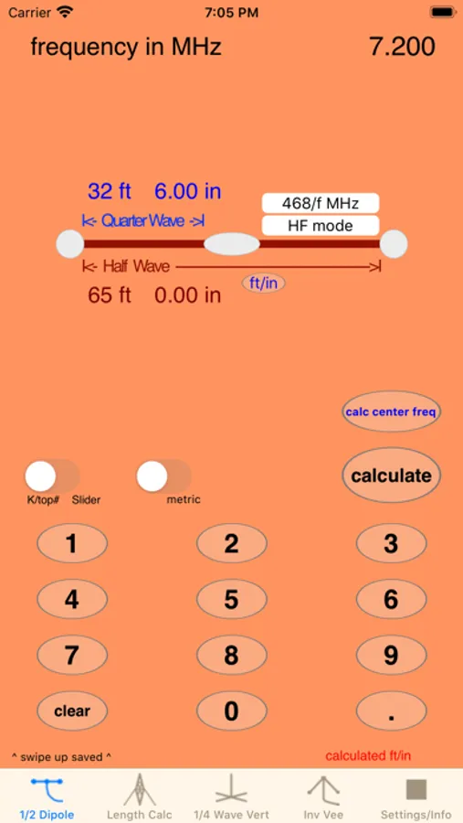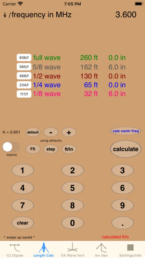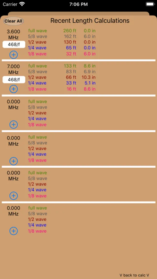 It will calculate the starting length for "Dipole's", "Inverted Vee's", "Vertical's" and has a page for calculating 1/8, 1/4, 1/2, 5/8 and "Full Wave" length.