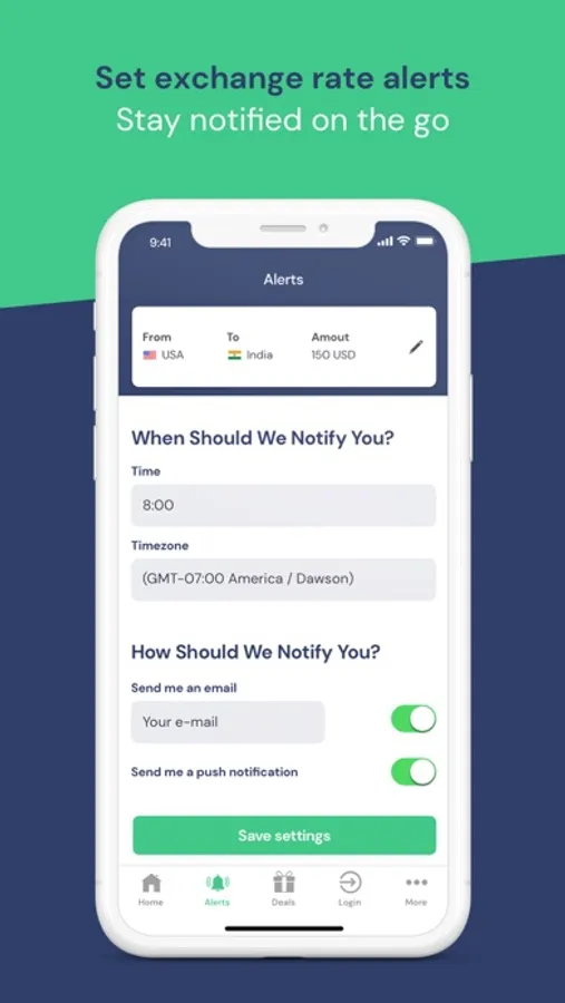 You can also setup custom alerts so you do not have to monitor remit exchange rates manually for your money transfer needs. Based upon your configured alerts, RemitFinder will notify you about the best remittance rates. In this manner, RemitFinder does the work of searching and comparing remit exchange rates for you instead of you manually checking rates every day to send money.