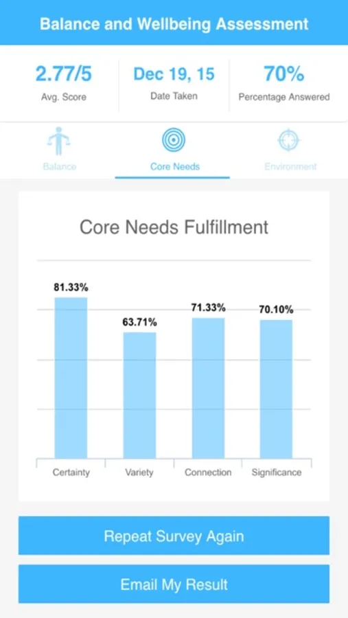 2. Core Needs Fulfilment. This shows you how you are meeting each of your fundamental “core human needs”. Areas assessed: