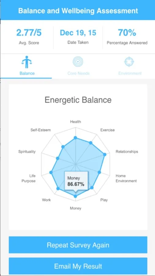 1. Energetic Balance. This shows you where you are choosing to invest your energy in life. A fuller and smoother energetic balance reflect more fulfilled and smoother life experiences. Areas assessed - Health, Exercise, Relationships, Home, Play, Money, Work, Purpose, Spirituality, and Self-Esteem.