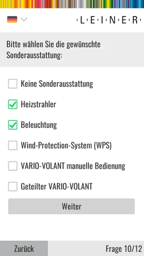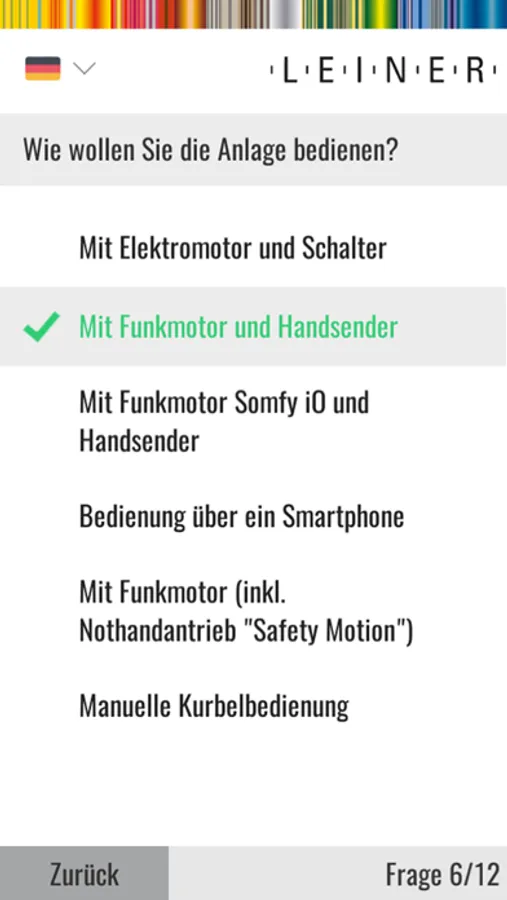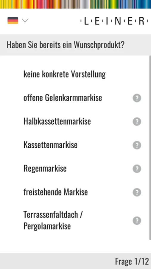 The awning planner is the perfect online consulting tool for searching a suitable awning system for your balcony or outdoor area. In 12 steps you answer the most important questions about your needs and the structural conditions. You will then receive a selection of all LEINER products that meet your individual requirements. Under each of the info buttons you will find a detailed product description. The results, including the questions and your answers, are easily sent to you by e-mail. With the awning planner, you can plan the design of your outdoor area from the comfort of your own home.