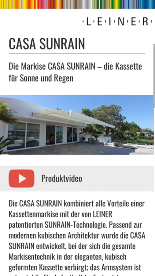 Leiner is a manufacturer of high-quality, customized awning systems and offers solutions for sun and rain protection. The product range includes: