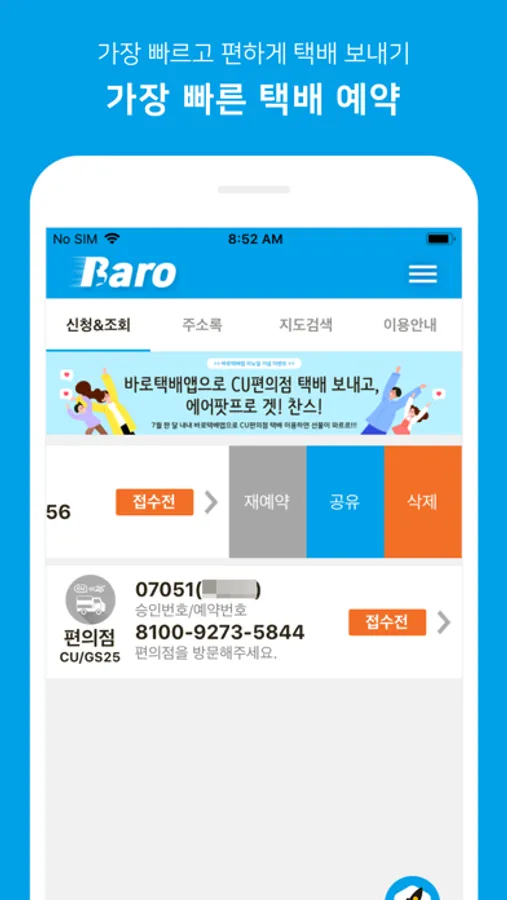 - 택배를 보냈던 주소를 확인하고 해당 주소로 가장 빠르게 택배 예약을 진행할 수 있습니다.