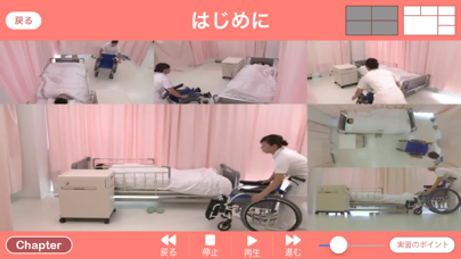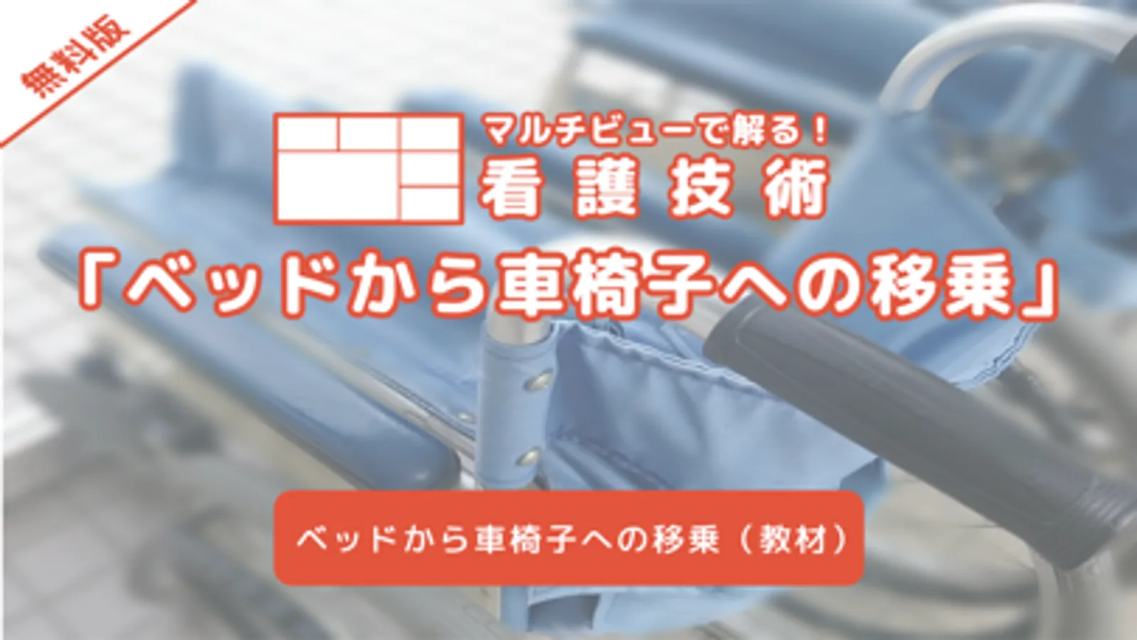 看護技術の修得を目的に、ベッドから車椅子への移乗という一連の看護技術を6方向のアングルで撮影された映像をリアルタイムに選択して見ることができる多視点映像の自習材です。