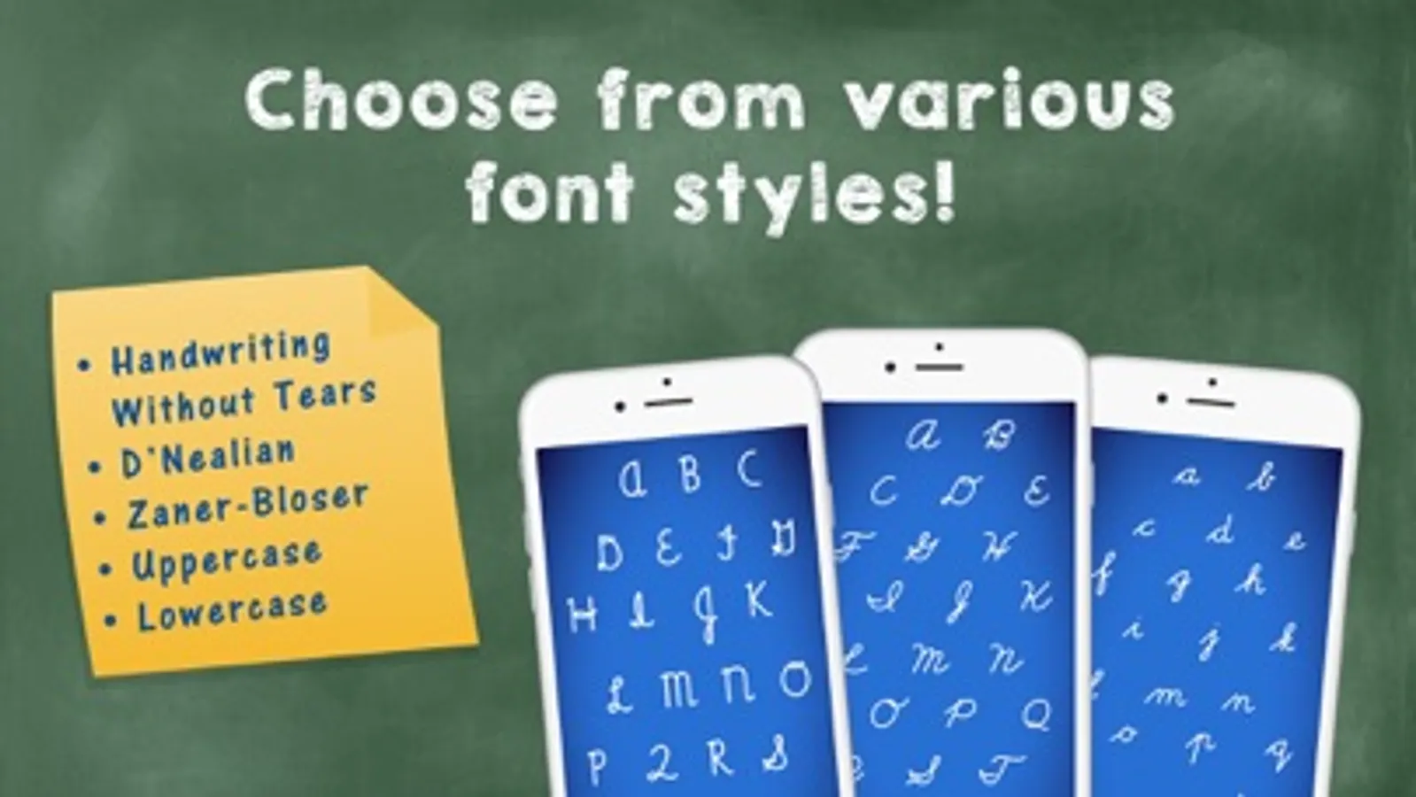 - Choice of the three most popular typefaces in handwriting education (Handwriting Without Tears, D’Nealian, and Zaner-Bloser).