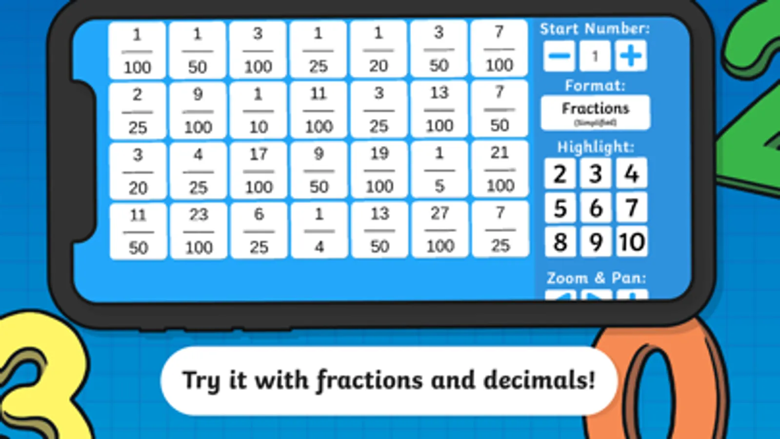 It offers you a classic hundred square grid, which can be customised to your specific needs. There’s a vibrant new highlighting option - a powerful and flexible tool to help you teach counting in multiples.