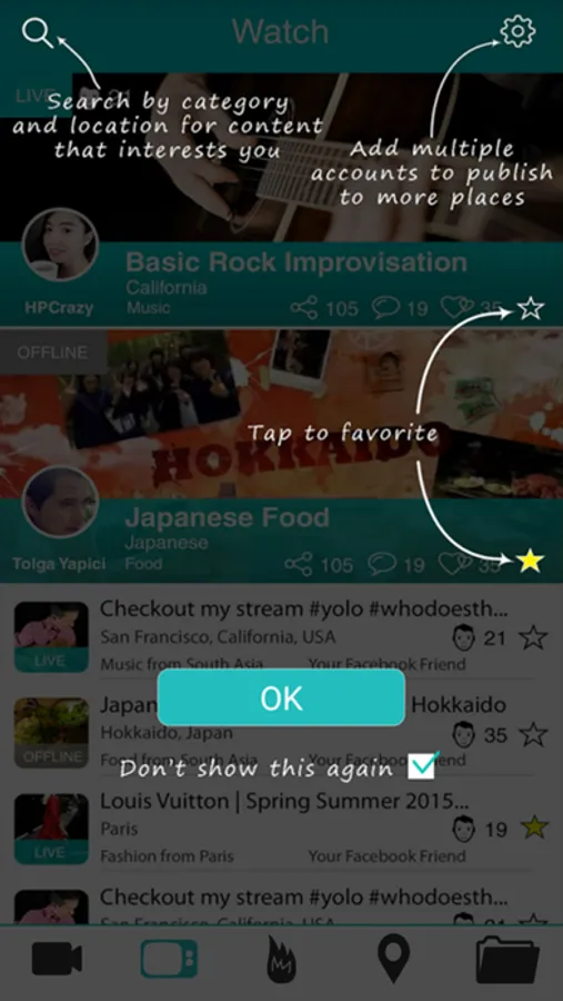 When you’re not LIVE Video streaming, you can search for and discover streams interesting to you. Location-based and categorized content is available at the tap of a finger. Never before has it been easier to put yourself in the moment.