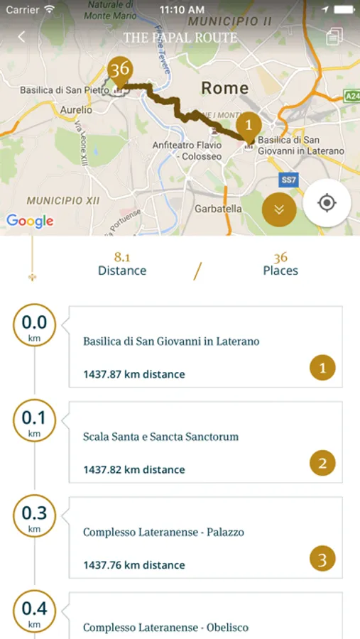 For each stage, it shows nearest stops of the Roma Cristiana Open Bus service provided by Opera Romana Pellegrinaggi, whose path has been specifically meant to assist the stages of the 4 Jubilee Routes. You are shown also the nearest stops of Rome's public transport (bus or metro).