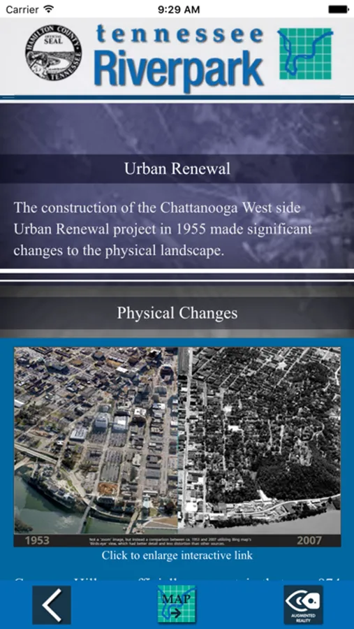 The Tennessee Riverpark App is made possible through a grant from the National Park Service to Hamilton County Tn. The mobile application utilizes modern technology to enhance the historic and educational interpretative opportunities along the Tennessee Riverpark. Please explore the rich history that exists within the Riverpark corridor via the use of this interactive mobile app that can be downloaded on your mobile device.