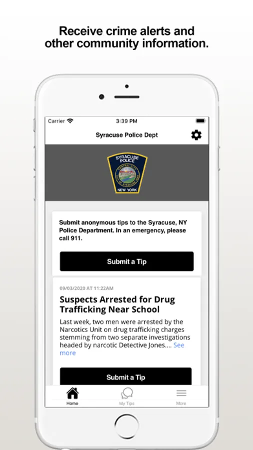 The Syracuse PD app provides the community the ability to submit anonymous tips to the the Syracuse, NY Police Department. The app also displays agency crime alerts, and other organization web and social media content.
