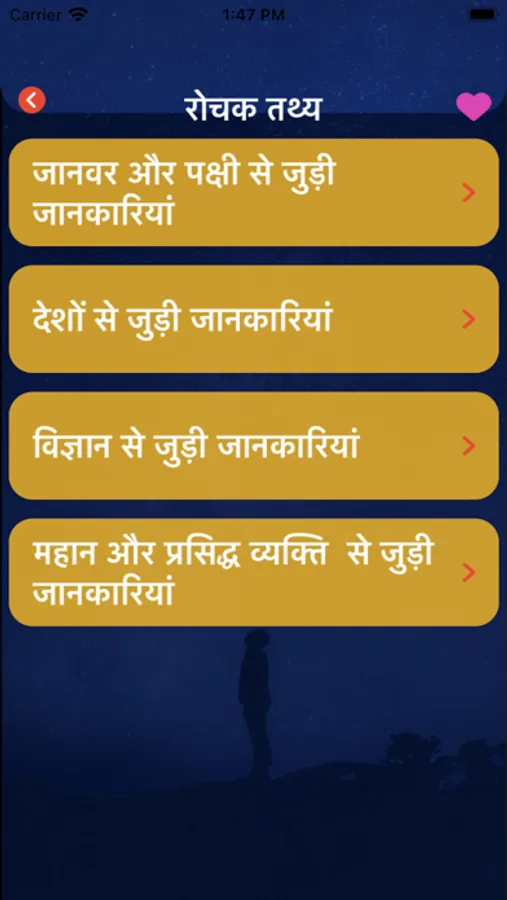 In the field of interesting facts, there are facts of more than 100 categories such as the human body, facts of the world, 50 thousand facts, interesting facts about the human body, interesting facts about life, list of the wonders of the world, facts about the magnificent earth, Awesome facts about school, facts of facts, strange facts about Hindi, amazing facts about animals, amazing facts, amazing latest facts, technical facts, strange facts about the moon, amazing facts about dreams, humanity Real facts, animal and bird facts, facts about nature, facts about the planet, facts of fresh countries, educational facts, shocking facts, interesting facts