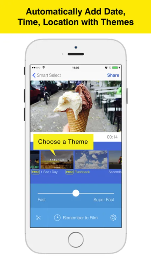Choose from a variety of Themes (includes IAPs): Pick from Behind the Scenes, Travel, 1 Sec a Day, Weekly and Monthly titles and more!
