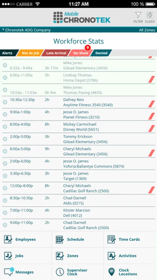 This tool raises the bar for outstanding management practices! This updated app allows Administrators & Supervisors to easily monitor daily workforce stats. The dashboard gives a quick overview of employees’ status: a flag will indicate if the clock-in/out was located “Not at Job” and if location tracking was denied by the employee. View no-show & late employees based on job schedules. Check actuals vs. schedules and help to control overtime. Filter by Zones to view data easily by department/group. Send “required read” text messages to employees. And there is much more…