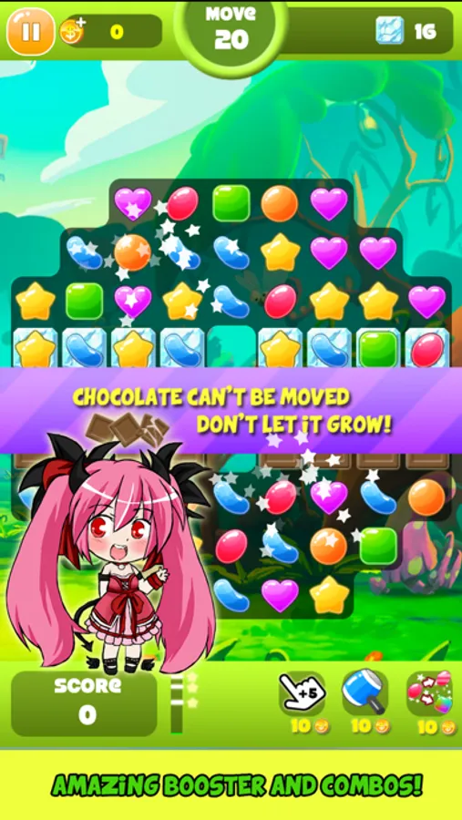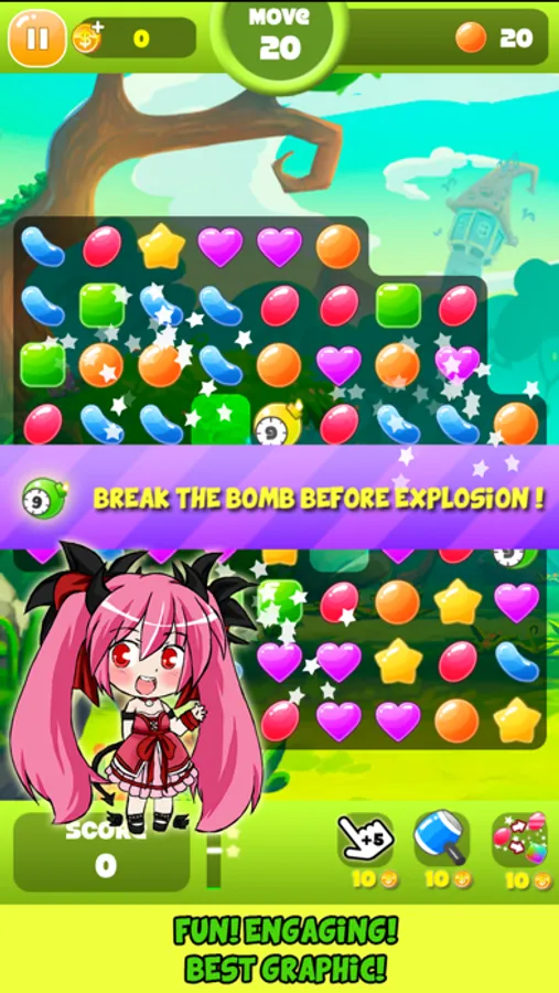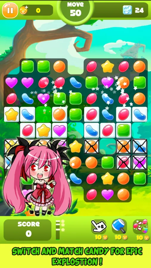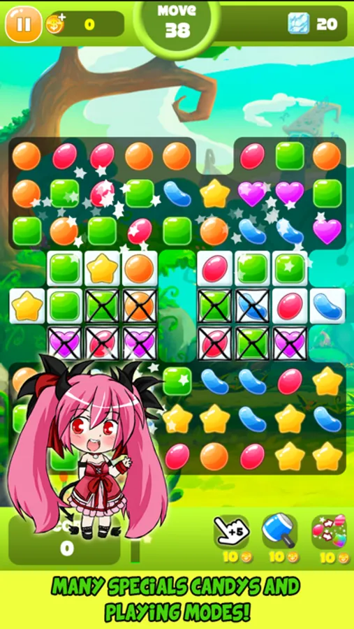 Objectives differ in over 100 levels. Make matches of 3 or more candies, create candy blasts! Starts out simple, but things get more and more interesting and challenging.
