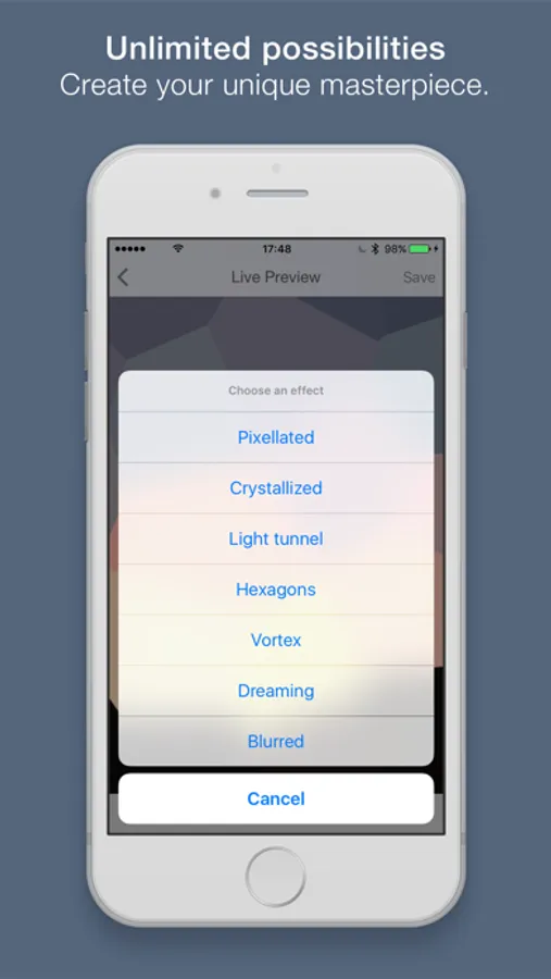 Create amazing live wallpapers in just a moment. Either choose a saved photo from your Camera Roll or shoot a new one. In a few seconds LivePapers will create an animated gorgeous retina wallpaper for you.