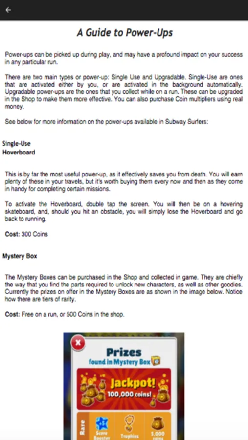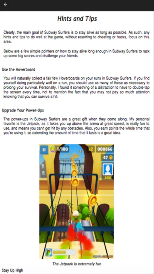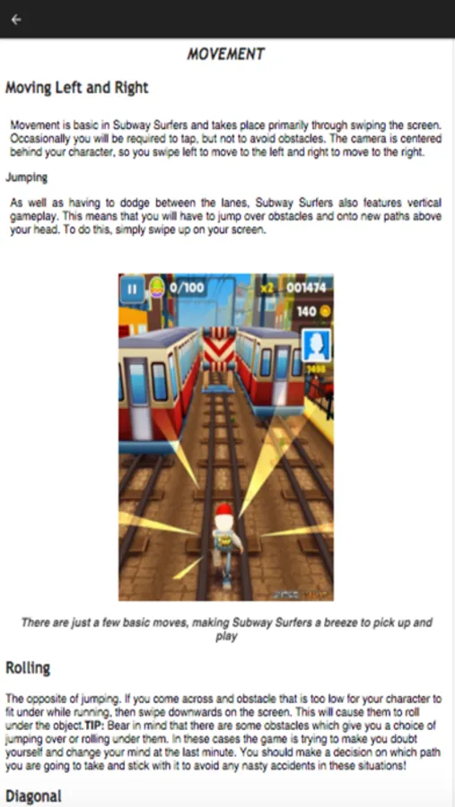 The number one Guide For Subway Surfers Here is an unofficial 100 %, this app is the huge and complete guide for this amazing game. You will find there exactly what are you looking for and what you need to enjoy this great game much better. It is perfect as for beginner as and intermediate players. Please note - This is not a game !! It's is the huge and complete game guide.