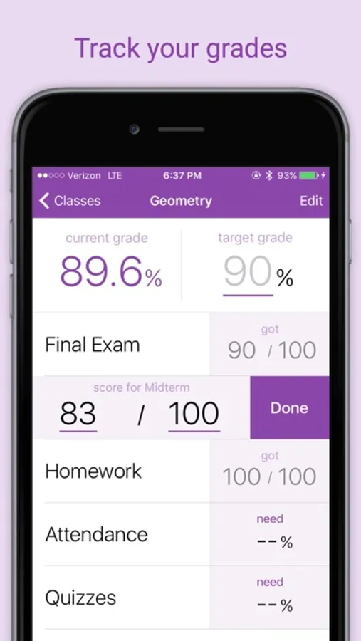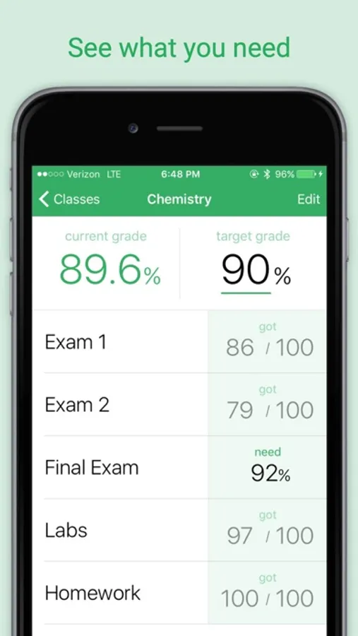 Grades shows what you need on your next test to hit your target grades and GPA.