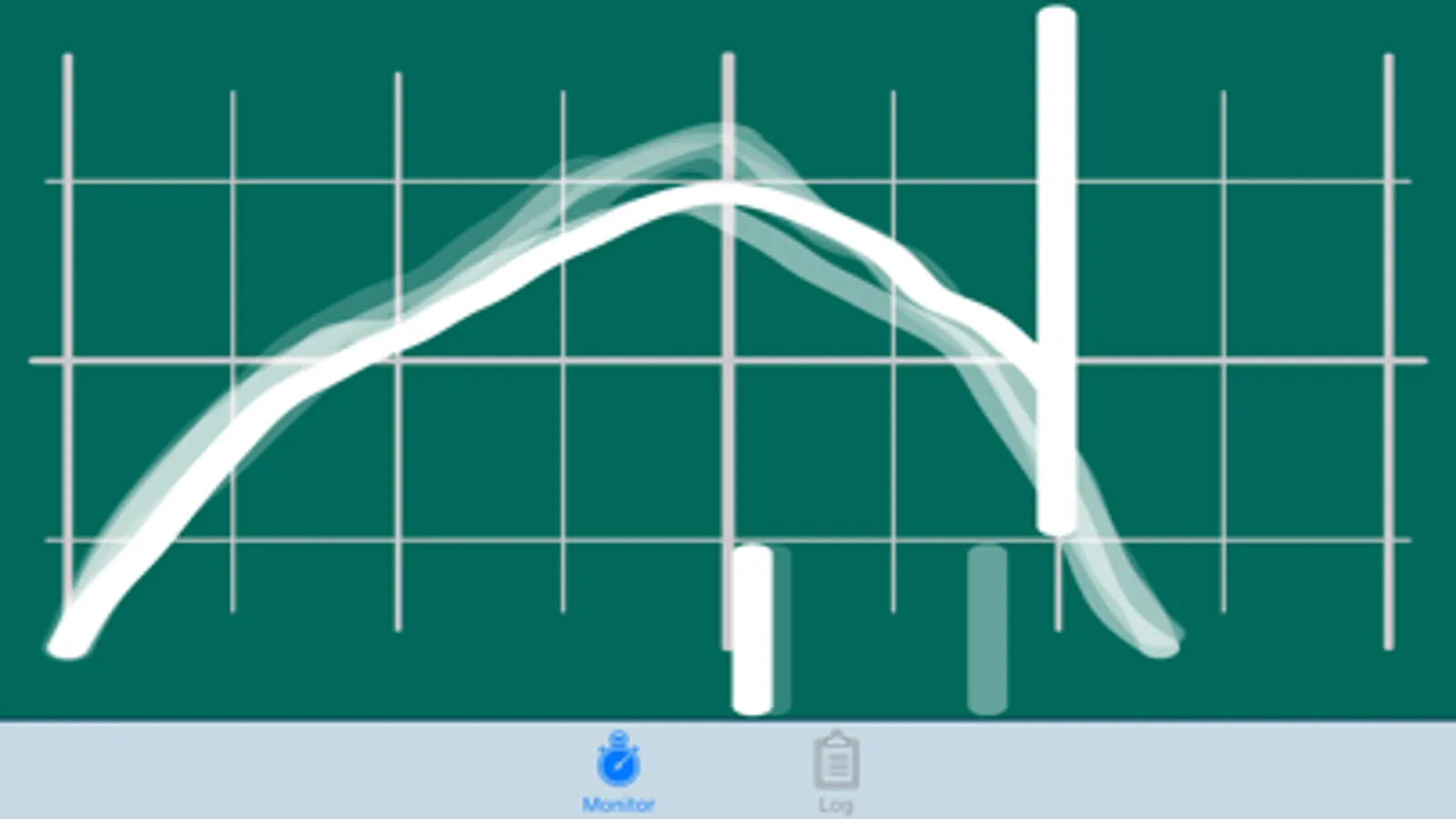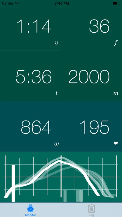 PainSled Basic also includes the “Stroke Scope”, a visualization of your last 5 rowing strokes along with drive-to-recovery ratio indicators. In landscape mode you can long-press the screen to make the Stroke Scope full-screen and use it to drill down on stroke-to-stroke consistency.