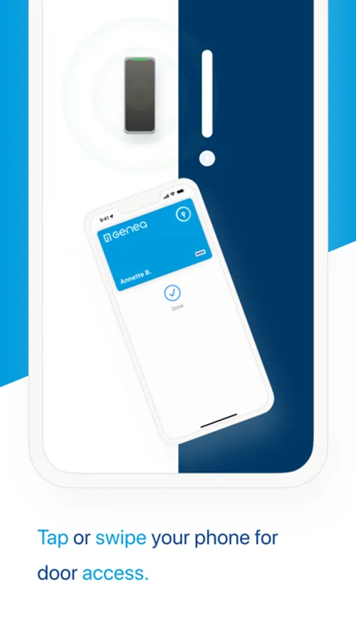 With Genea Mobile Access, your smartphone becomes your keycard. Simply tap your phone to a Genea Mobile Access-enabled reader, the same way you would a keycard, and the door will unlock. You may also have the option to open the door or gate from a distance by twisting your phone.
