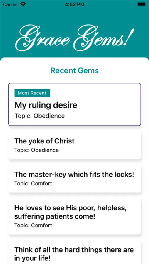 Receive daily notifications when new devotionals are posted! The complete database of "Gems" have been categorized by topic for quick reference and the main app screen displays the latest 4 "Gems", so you can easily catch up!