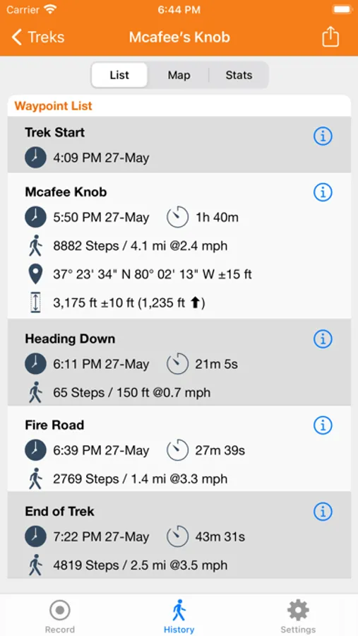 Track Your Trek uses the built-in pedometer on your iPhone to calculate distance traveled and speed. You can track your route automatically or chose to only record waypoints manually. Options for route tracking allow you specify the frequency at which your location is recorded to conserve your battery on longer hikes. You may view your route and recorded waypoints on a map and export your journey to a GPX file.