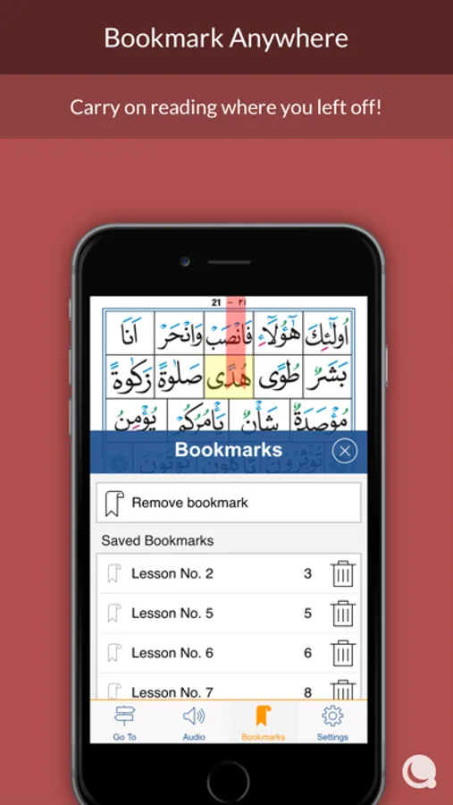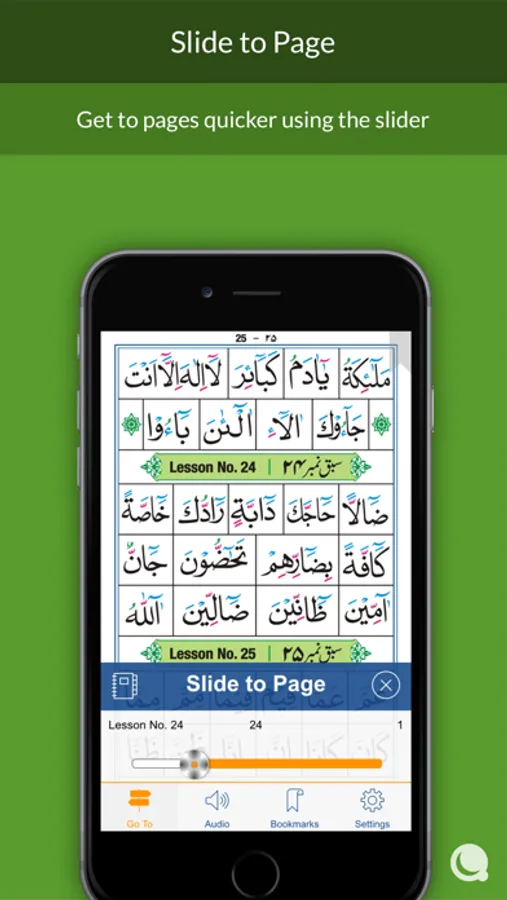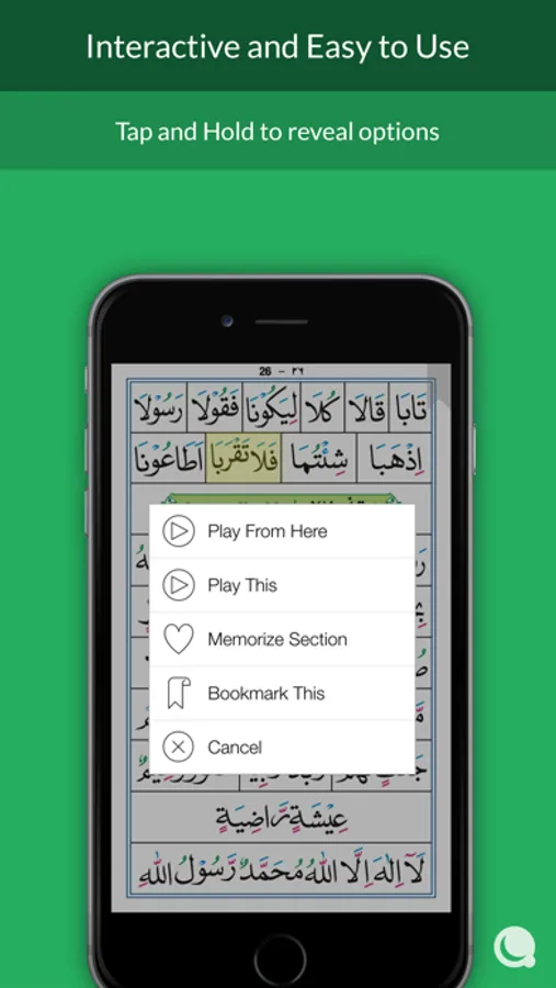 Simply tap and hold on any sentence to play the recitation,repeat and practice, and bookmark.