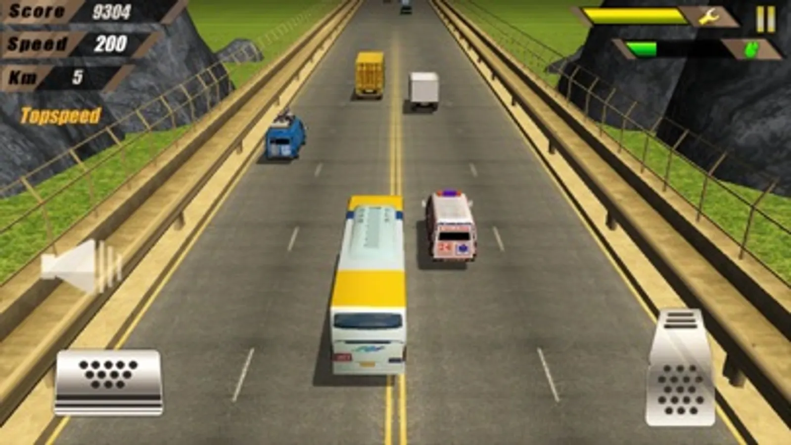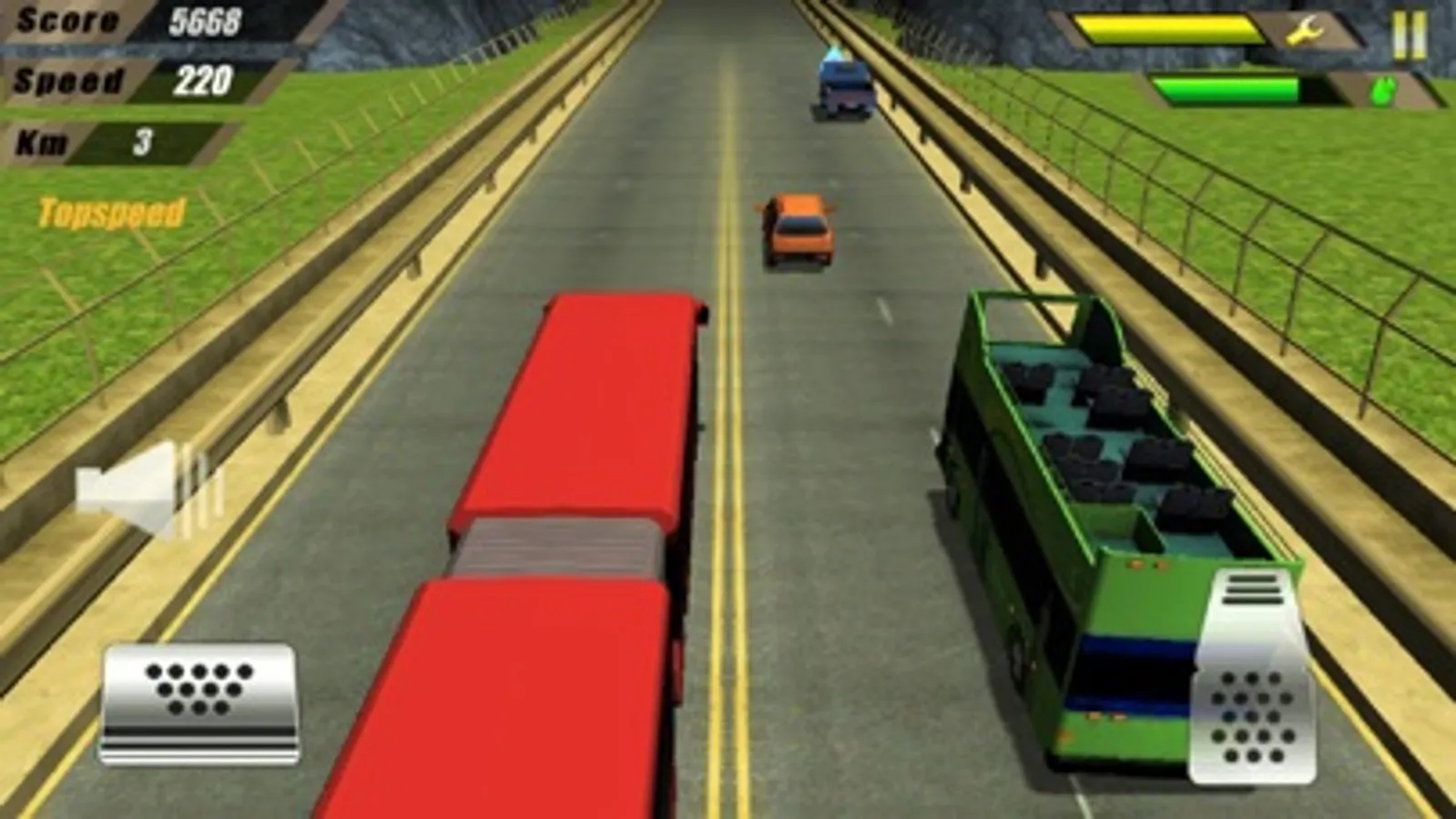Ever imagined 3D speed bus race through highway is now set to go! Drive your bus through highway traffic, earn cash and upgrade various new buses. Be careful with the traffic and don’t crash with other vehicles, but you can go closer to each vehicle and make close calls and earn more points and cash. Be in the top speed and unlock all the achievements listed which will be rewarded automatically. Note that since it is high speed real race and hence you must pick up Petrol/Gas/Diesel on your way to maintain your tank filled, and you can also repair your bus by picking up Repair Tool Box.