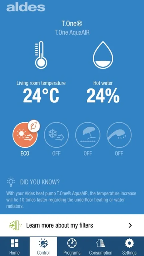 Your room is too cold? You have friends for the weekend, you’re worried about running out of hot water? It's easy, with AldesConnect ™ and ALDES heat pump solutions, you can control: manage your thermal comfort room by room, the quantity of domestic hot water, and visualize your energy costs.