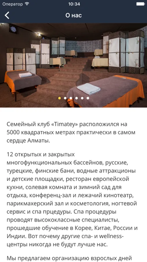 12 открытых и закрытых многофункциональных бассейнов, русские, турецкие, финские бани, водные аттракционы и детские площадки, ресторан европейской кухни, солевая комната и зимний сад для отдыха, конференц-зал и лежачий кинотеатр, парикмахерский зал и косметология, ногтевой сервис и спа прцедуры. Спа процедуры проводят высококлассные специалисты, прошедшие обучение в Корее, Китае, России и Индии. Вот почему другие спа- и wellness-центры никогда не будут лучше нас.